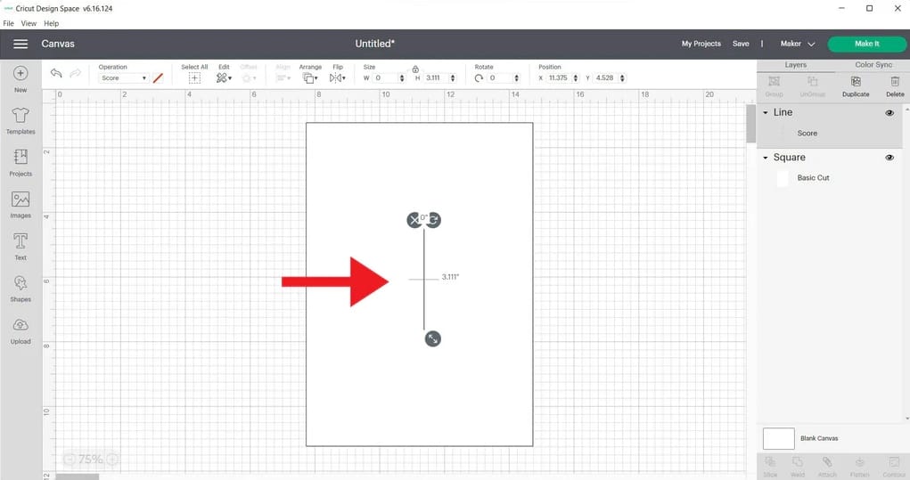 Cricut primero marcará la cartulina a lo largo de la línea marcada. Luego, recorta la base de la tarjeta.