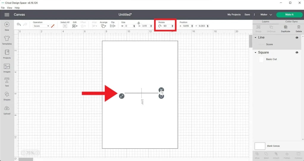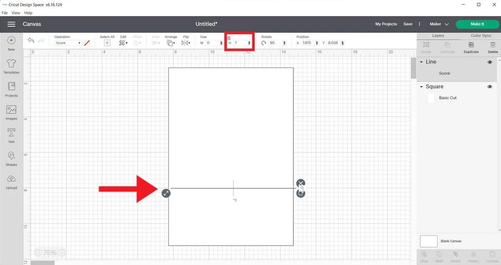 Haz clic en el icono de candado en la esquina inferior izquierda del cuadrado para desbloquear las dimensiones del cuadrado. Luego cámbialos en el menú superior al tamaño de la base de tu tarjeta sin terminar, que en este proyecto es 7 x 10.
