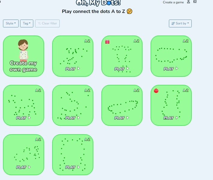 ¡Estos juegos de conectar los puntos son increíbles! Puedes ordenar por número de puntos, tipo de juego (números, alfabeto o números romanos), estilo y etiqueta, para que puedas encontrar exactamente lo que buscas.