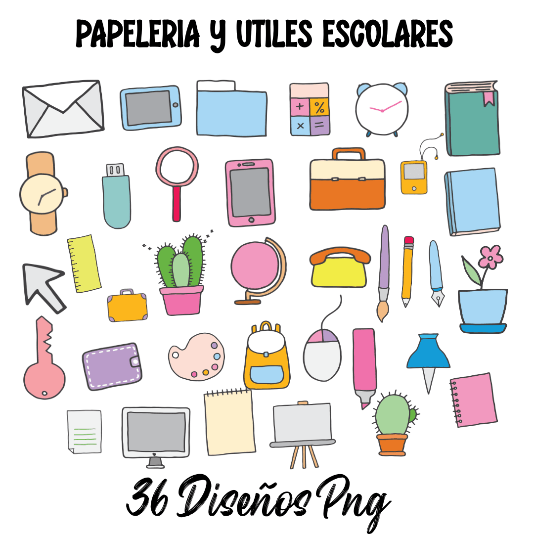 ✏️📚 Stickers de Papelería y Útiles Escolares – 36 Diseños PNG | Recursos Digitales para Imprimir