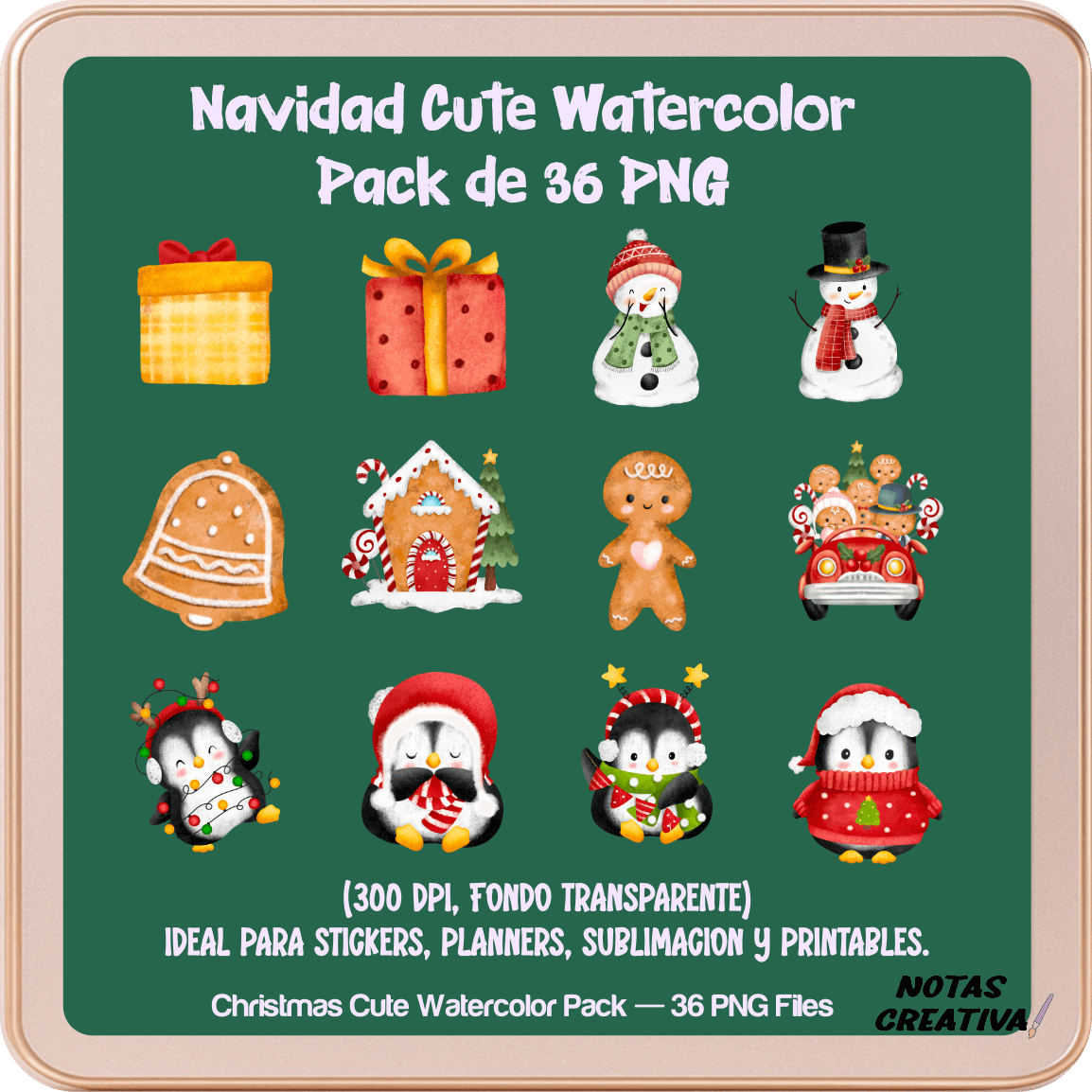 Celebra la temporada con este Kit Temático “Navidad Cute Watercolor”, una colección premium de 36 ilustraciones PNG con fondo transparente, creadas especialmente para planners, stickers, sublimación y manualidades digitales.